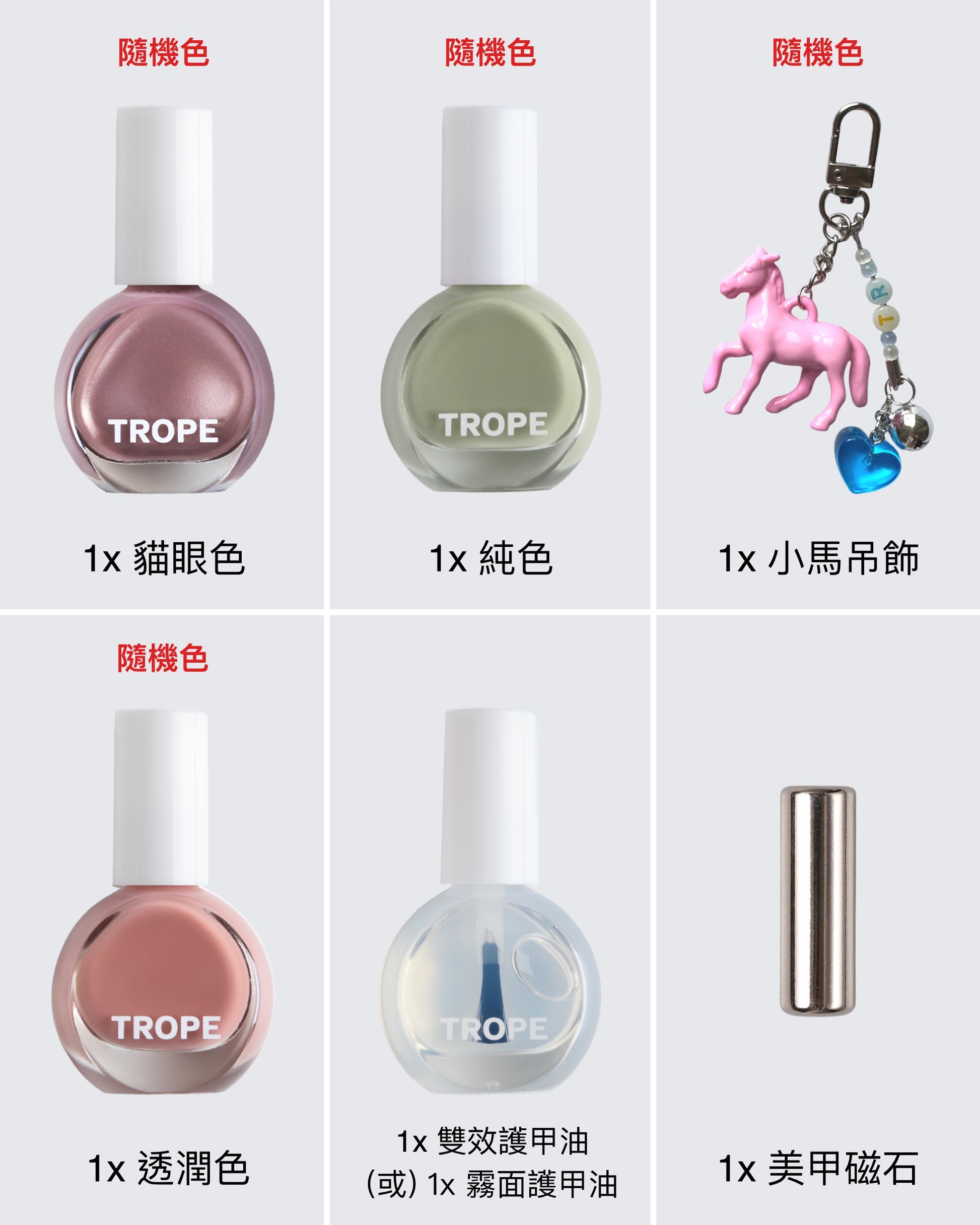 內含經典純色、透潤色及磁性貓眼色各隨機一款,搭配必備「雙效護甲油」,讓上色更順滑並增亮固色,或者「霧面護甲油」呈現精緻柔霧質感。另附專用「美甲磁石」,可打造立體玻璃珠貓眼效果。每組亦隨機贈送Y2K風格幸運小馬吊飾,遇見專屬於你的獨特幸運!限量供應,售完為止。