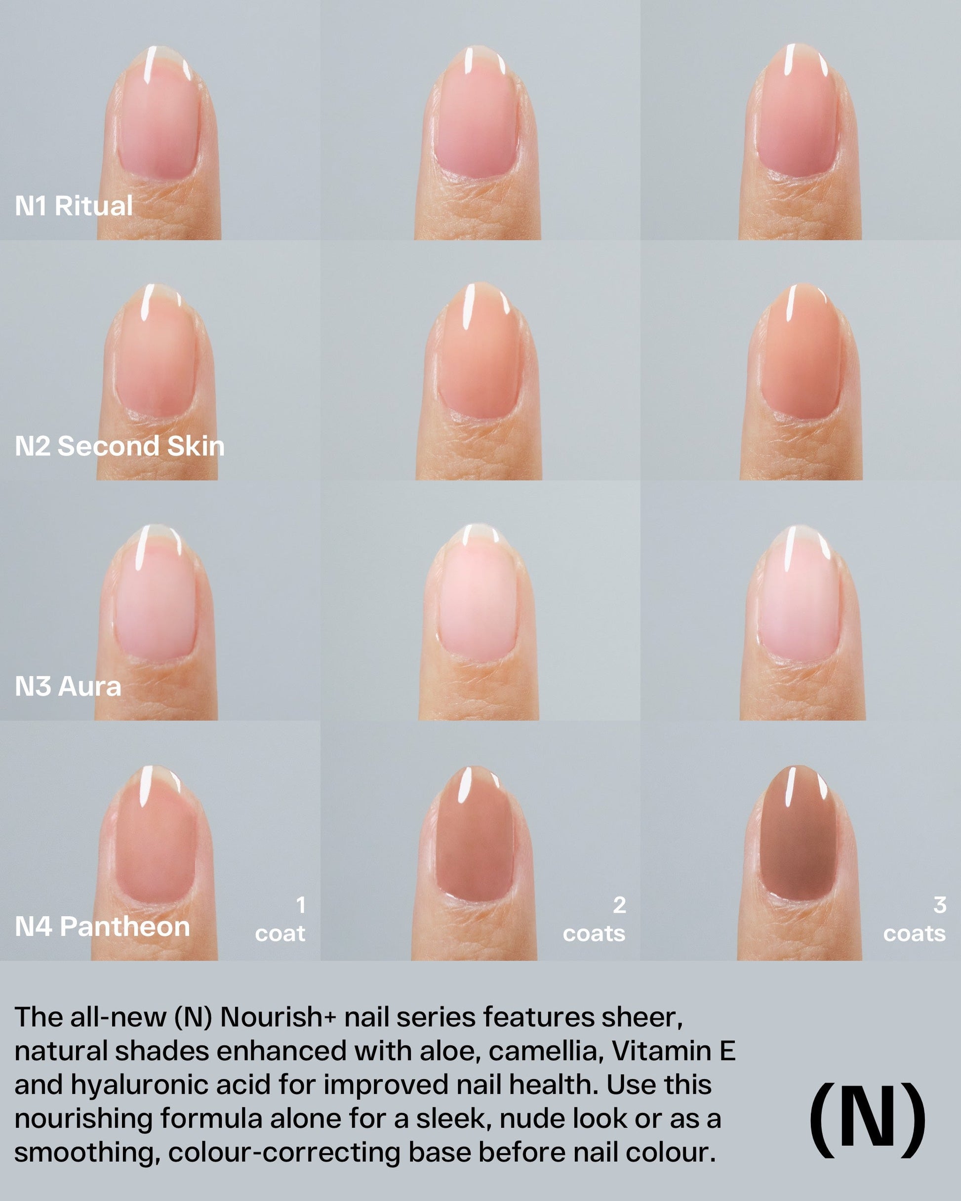 此色為 (N) Nourish+ 系列,主打透明感的自然裸色調。可依喜好疊擦調整顯色度,營造猶如天生的裸感甲,亦可作為潤色打底使用。特別添加蘆薈、山茶花、大豆維他命E及玻尿酸等萃取滋養成分,進而呵護指甲健康。